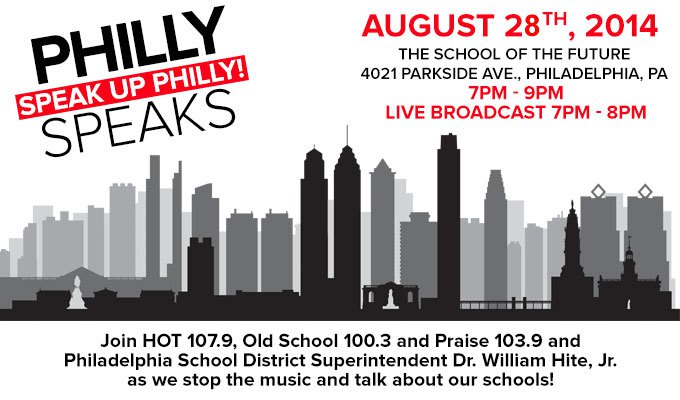 Tonight Philly is all about you! Lift your voice up at “Speak Up Philly” tonight at The School of the Future, 4021 Parkside Avenue. Our Radio One-Philly cluster will team up with The School District of Philadelphia’s Superintendent Dr. William Hite Jr., from 7pm-9pm; however, if you can’t join us, we will broadcast live from 7pm-8pm! This is your chance to “Speak Up Philly!”